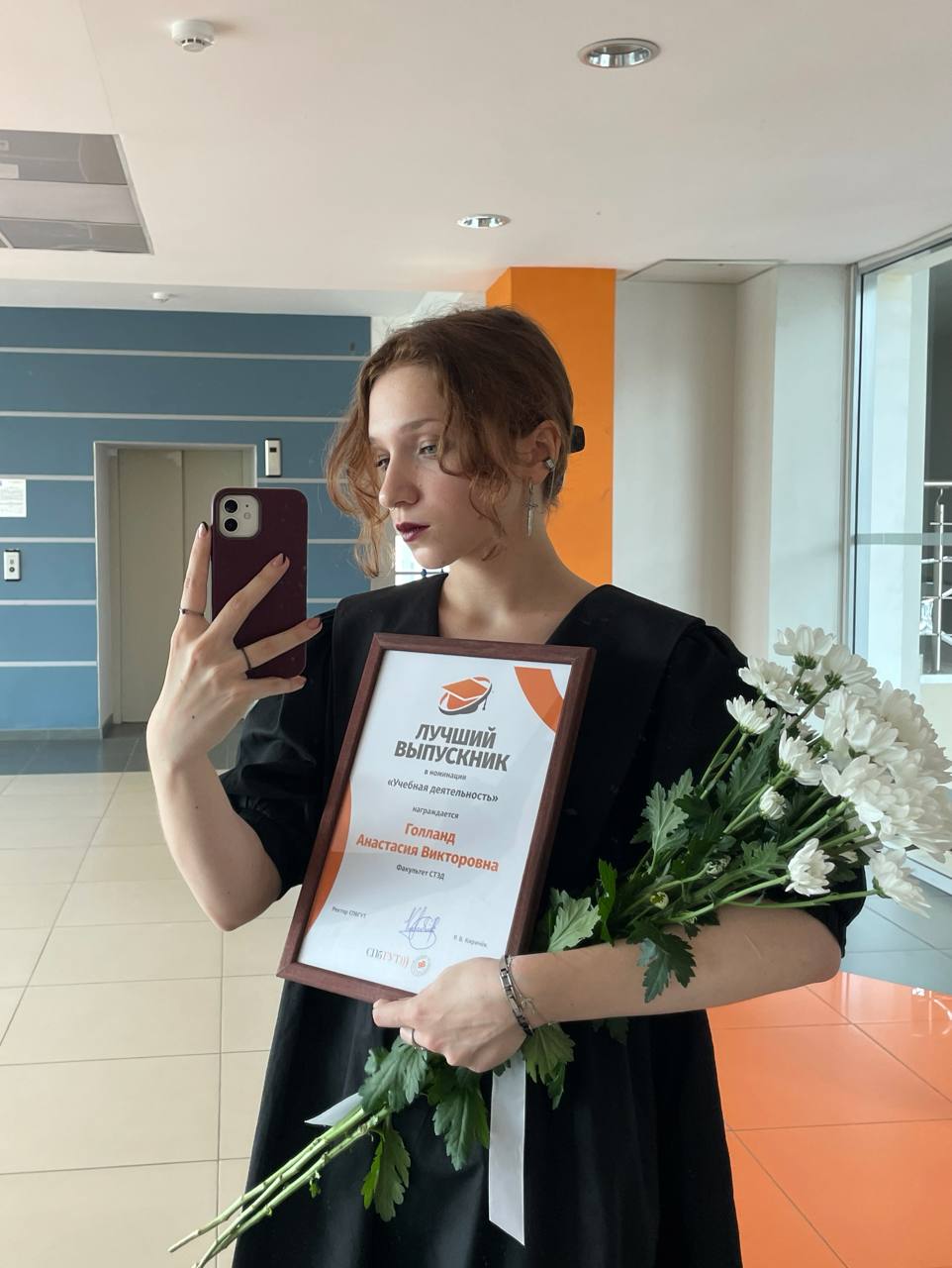 Анастасия Голланд защитила ВКР на кафедре ИРВ СПбГУТ летом 2025 года, а затем поступила по портфолио в магистратуру Гуманитарного института Санкт-Петербургского политехнического университета.