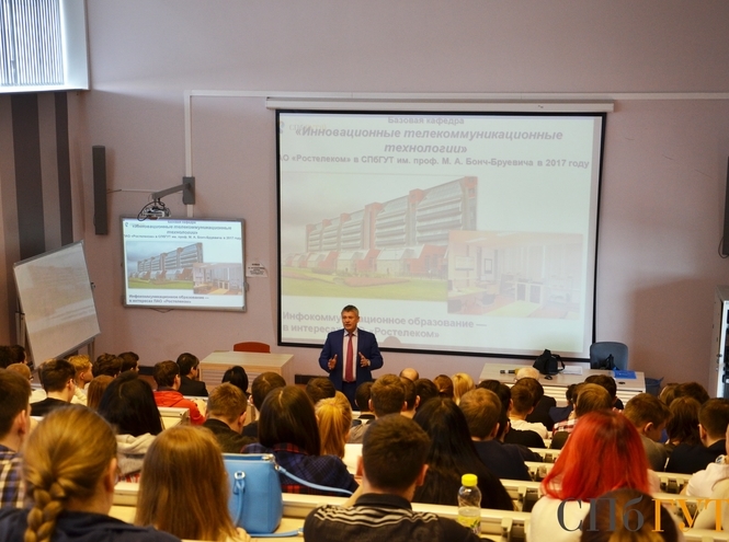 В СПбГУТ стартовал новый конкурсный отбор на базовую кафедру «Ростелекома». 19 апреля в Санкт-Петербургском государственном университете телекоммуникаций (СПбГУТ) им. Бонч-Бруевича состоялась установочная встреча руководства макрорегионального филиала «Северо-Запад», посвященная работе базовой кафедре «Инновационные технологии телекоммуникаций». Ведущей мероприятия выступила директор по организационному развитию МРФ «Северо-Запад» Ирина Тамбовская. Открыли встречу Вице-президент — Директор макрорегионального филиала «Северо-Запад», заведующий кафедрой Андрей Балаценко и ректор СПбГУТ Сергей Бачевский. Далее с подробной презентацией о кафедре «Ростелекома» и об особенностях обучения рассказал заведующий кафедрой инфокоммуникационных систем Борис Гольдштейн.