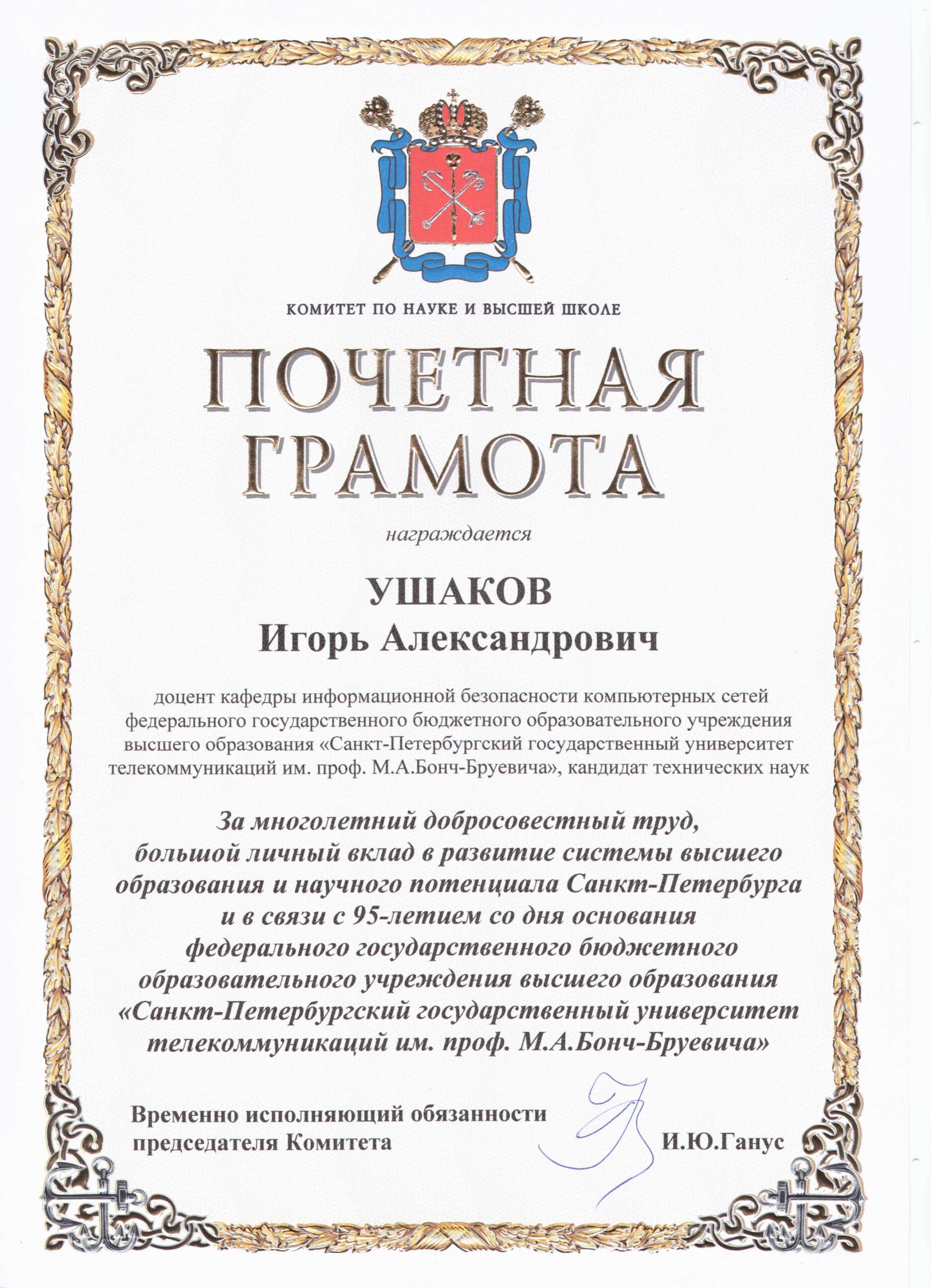 Игорь Александрович Ушаков работает в СПбГУТ с 2006 года, в настоящее время – в должности и.о. заведующего кафедрой информационной безопасности компьютерных сетей, доцентом кафедры инфокоммуникационных систем, является руководителем образовательных программ бакалавриата 11.03.02 и магистратуры 11.04.02 «Инфокоммуникационные технологии и системы связи», профиль «Защищенные системы и сети связи», специалитета 10.05.02 «Информационная безопасность телекоммуникационных систем», членом ученого совета факультета кибербезопасности, учебно-методического совета института магистратуры, научным руководителем программы переподготовки "Кибербезопасность умного города" Цифровой кафедры СПбГУТ, руководителем академии Eltex СПбГУТ, ведущим лектором кафедры по блоку дисциплин безопасности компьютерных сетей и центров обработки данных.