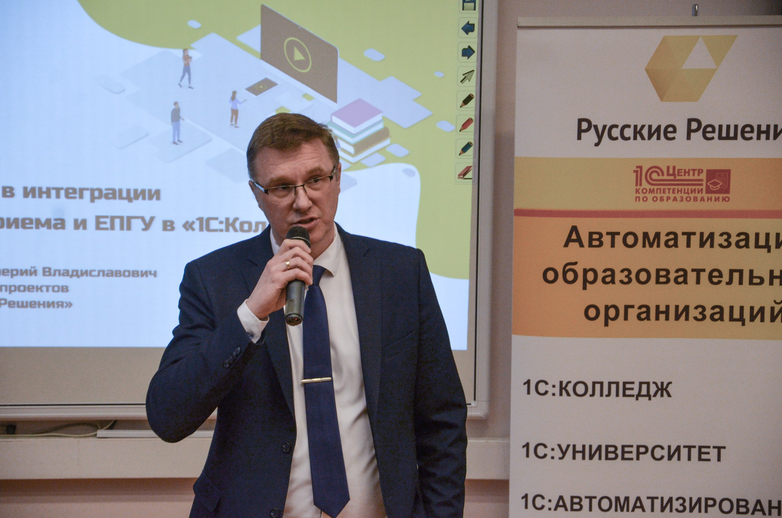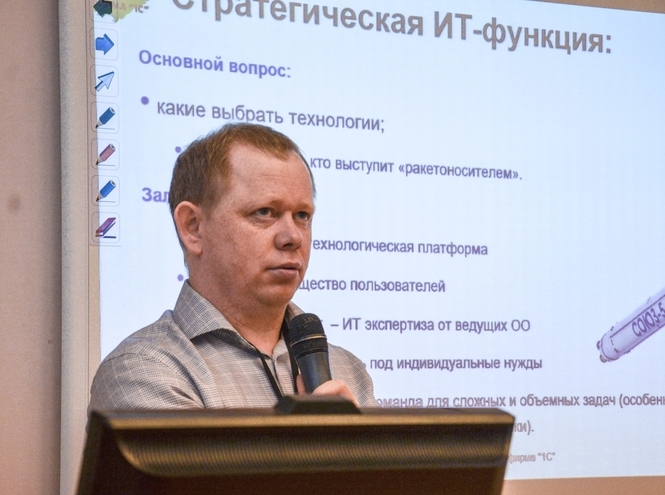 В заседании круглого стола также приняли участие ведущие разработчики программного обеспечения для образовательных организаций. Особый интерес вызвали решения фирмы «1С», которые представлял руководитель проектов Александр Родюков.