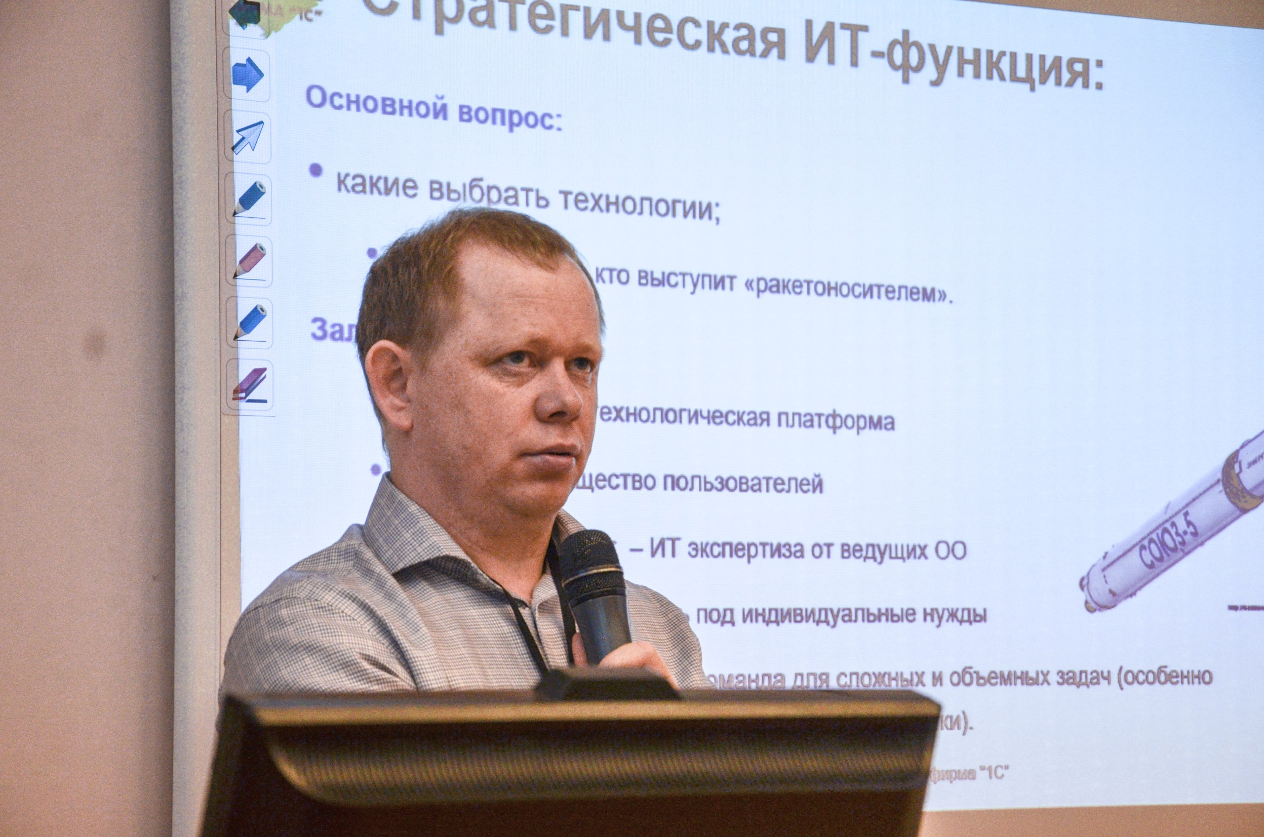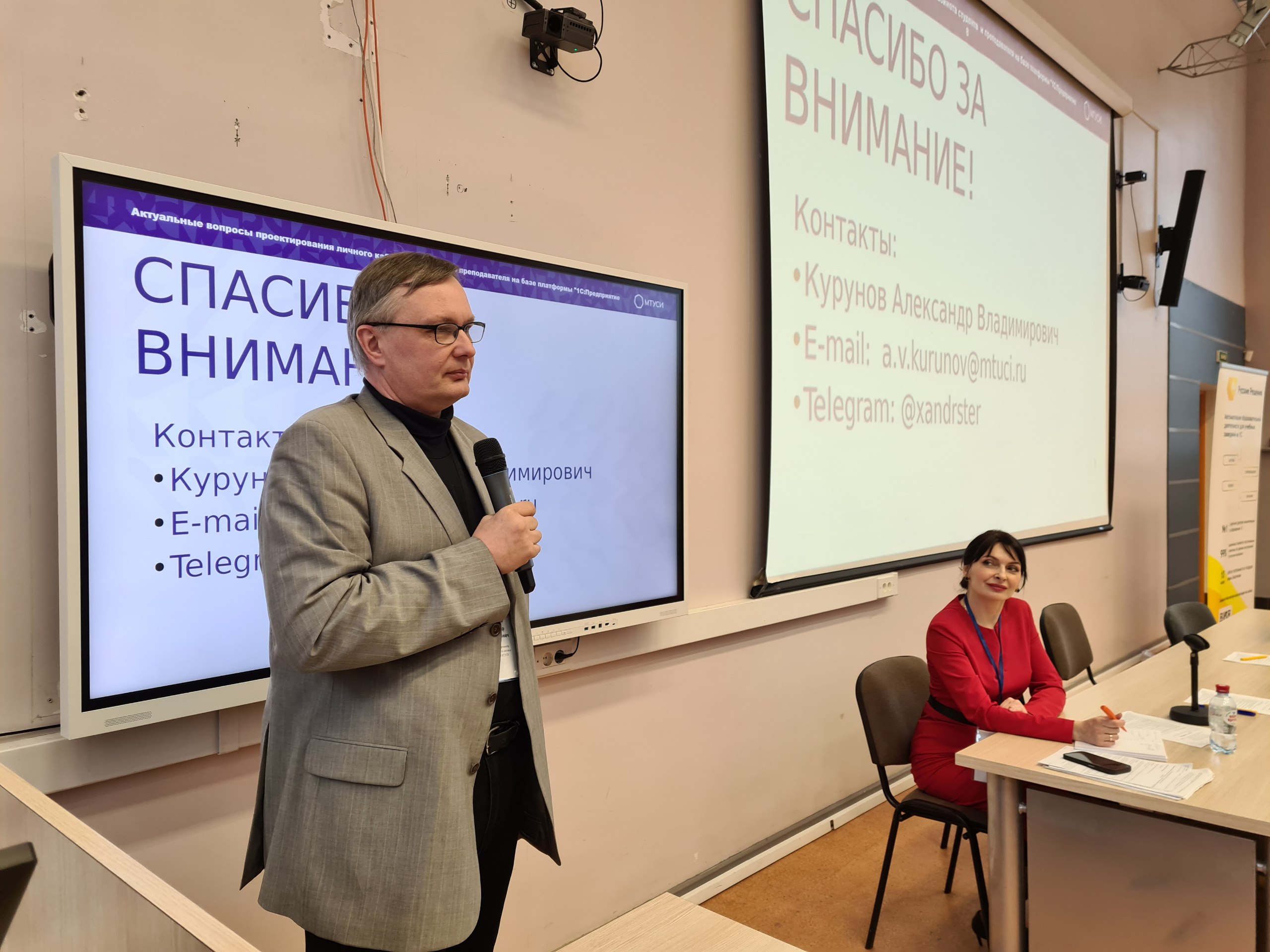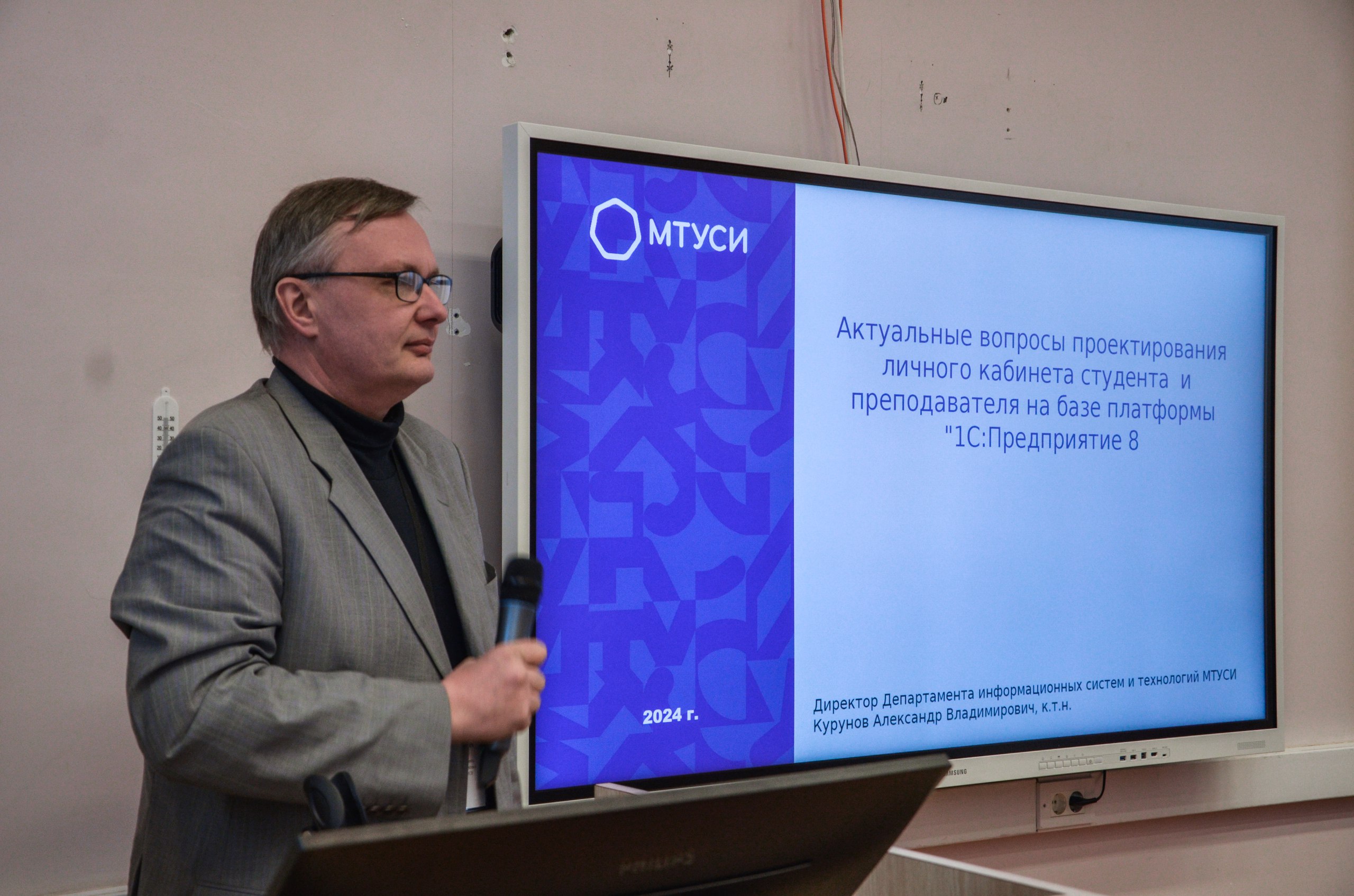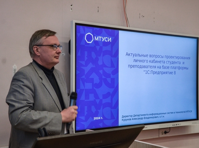 Выступление директора департамента информационных систем и технологий МТУСИ Александра Владимировича Курунова было посвящено актуальному вопросу проектирования личного кабинета студента и преподавателя на базе платформы «1С: Предприятие 8».